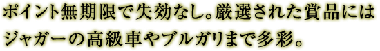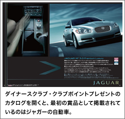 ダイナースクラブのクラブポイントは利用1万円ごとに1ポイント(100円相当)と単位が大きく、交換できる賞品もダイナースクラブが厳選したこだわりの賞品ばかり。ブルガリなどの有名ブランドや液晶テレビなどの家電、ダイナースクラブオリジナルの小物から、ジャガーの車までがカタログに掲載されています。